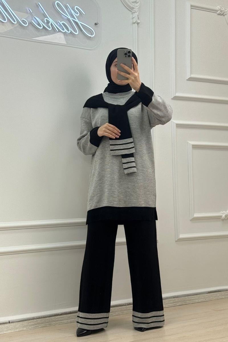 Atkı Detaylı Gri-Siyah Tesettür Triko Takımhm1338