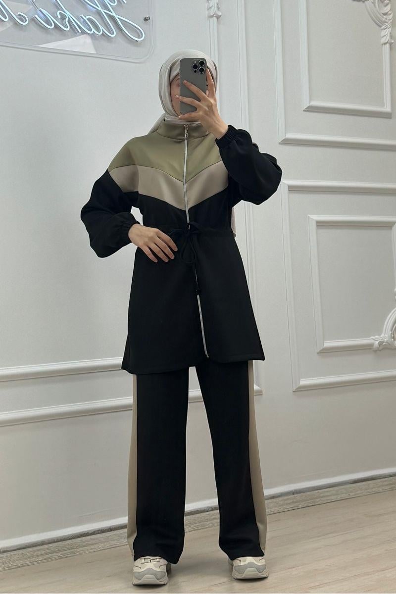 Fermuarlı Siyah Scuba Tesettür TakımHM1342