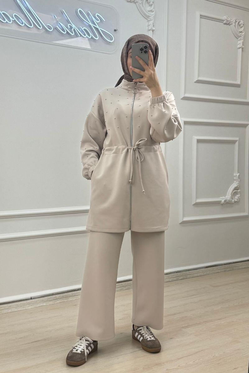 İnci Detaylı Bej Tesettür İkili Takım (HM1340)