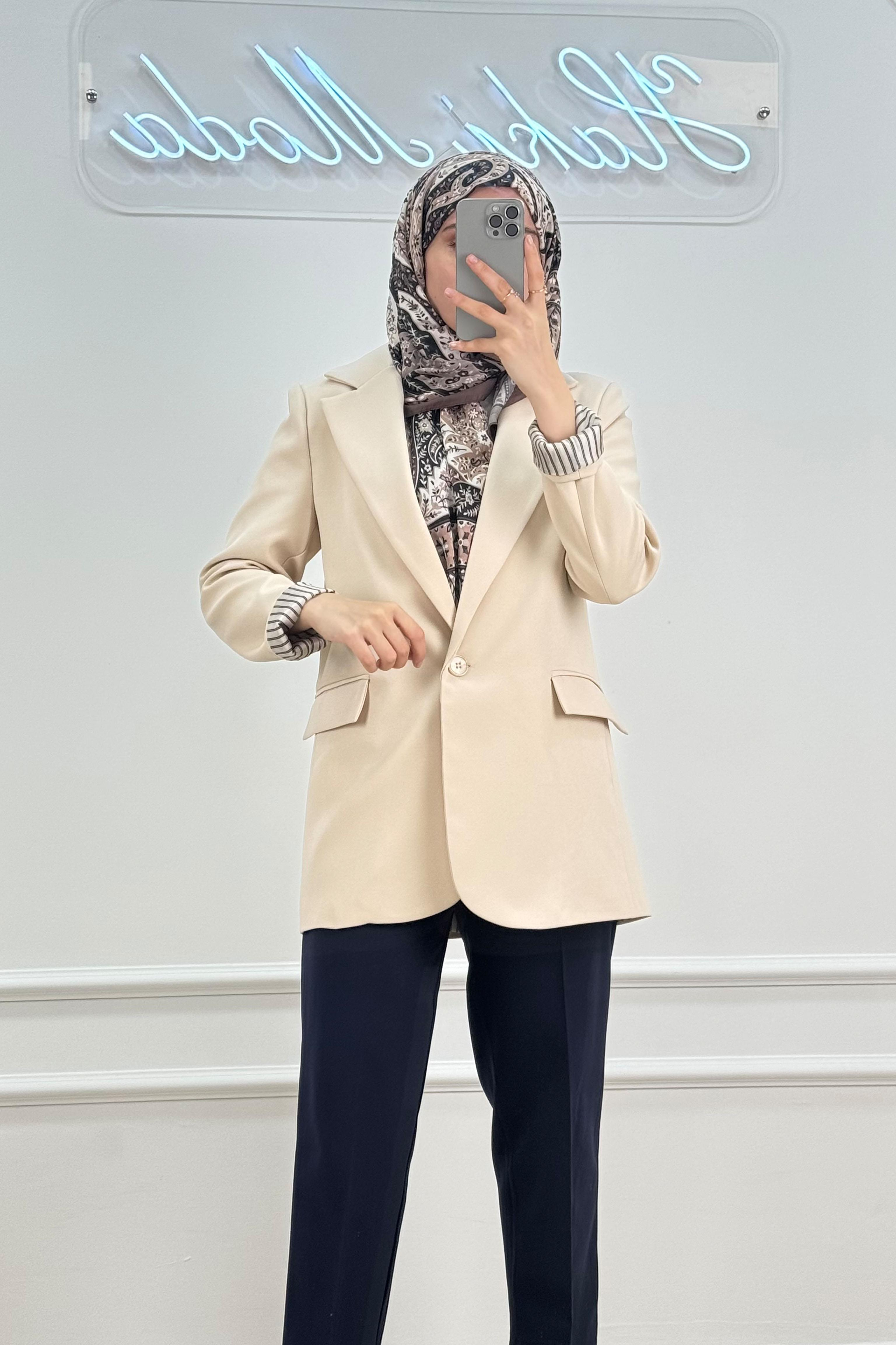 Yeni sezona özel Hakimoda Astar Çizgili Ceket Taş (HM1323); birinci sınıf double kumaştan üretilmiştir, boyu 80 cm. Taş rengindeki çizgili dokusu ile dikkat çeken bu ceket, astarlı yapısı sayesinde hem konfor sağlar hem de dış görünümde asalet sunar. Şık kesimi sayesinde iş kombinlerinden sokak stilinize kadar her ortama uyum sağlar. Şimdi gardırobunuza stil katın!