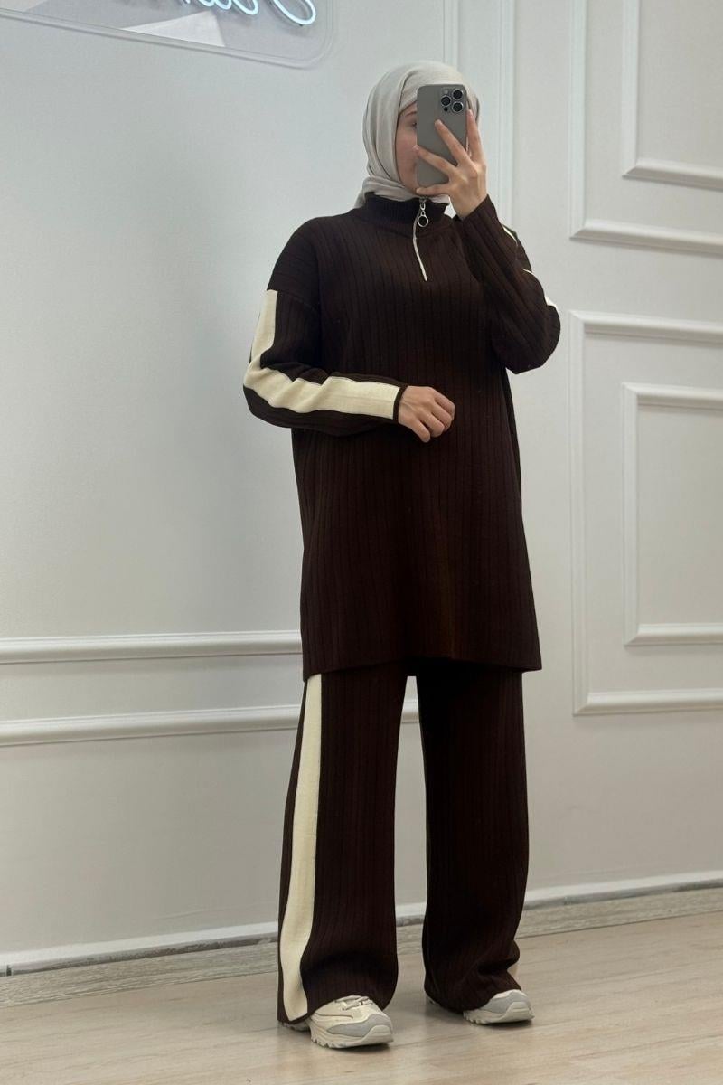 Şerit detaylı kahverengi tesettür triko takım; sıcak kahve tonlarıyla zarif ve rahat bir duruş sunar. Yumuşak triko kumaşı, modern şerit detayları ve tesettür uyumlu kesimiyle günlük şıklığın anahtar parçasıdır. Hem konforlu hem de stil sahibi görünmek isteyen kadınlar için ideal bir tercih.